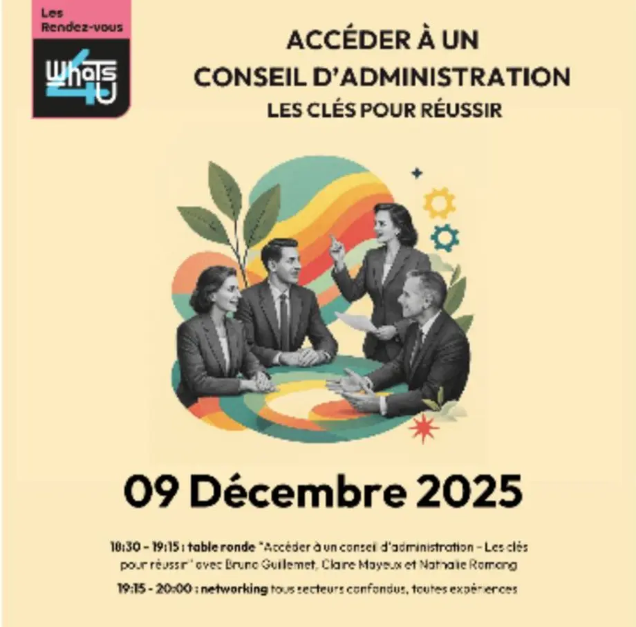 Whats4u réunit Bruno Guillemet (Conseiller principal et administrateur indépendant), Claire Mayeux (Présidente Fondatrice de Pulse and Impact Advisory) et Nathalie Romang (Investisseuse / administratrice indépendante) : ils donneront des clés pour accéder à un conseil d'administration, puis seront là pour répondre à vos questions.