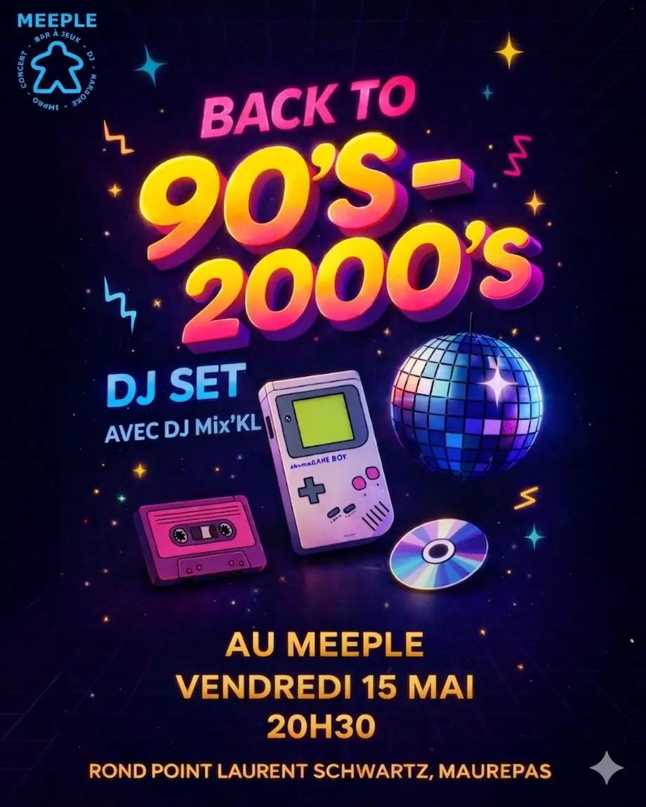 Le vendredi 15 mai dès 20h30, Le Meeple se transforme en machine à remonter le temps avec DJ BPM aux platines. Préparez-vous à chanter (et danser) sur les plus gros hits des années 90 et 2000.