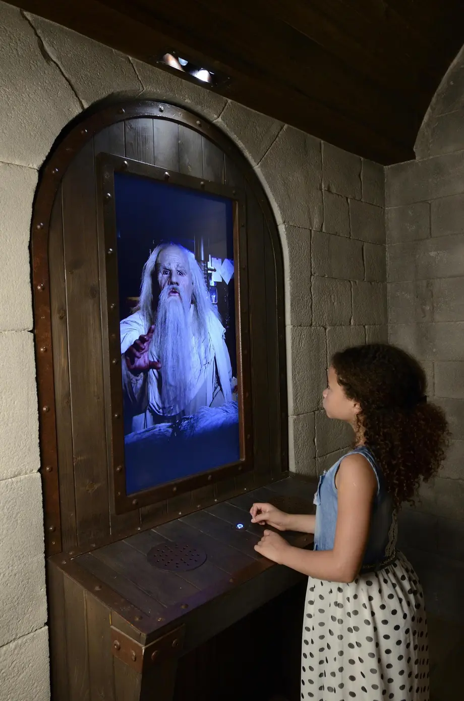 Une jeune fille interagit avec un écran affichant l'image d'un homme âgé aux longs cheveux et à la barbe blanche dans un décor médiéval.
