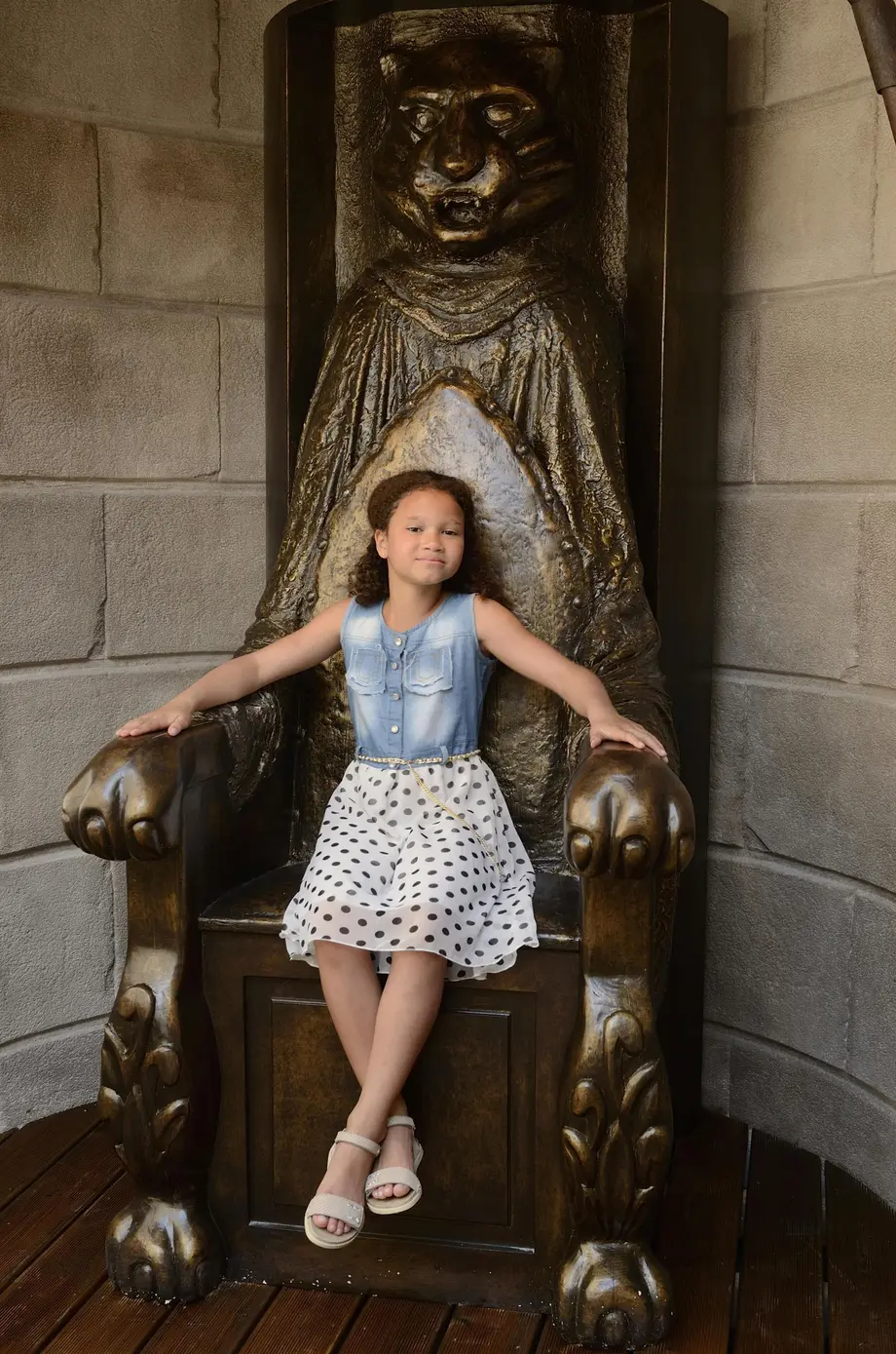 Une jeune fille vêtue d'un haut en jean et d'une jupe à pois est assise avec assurance sur un grand trône orné en forme de créature.