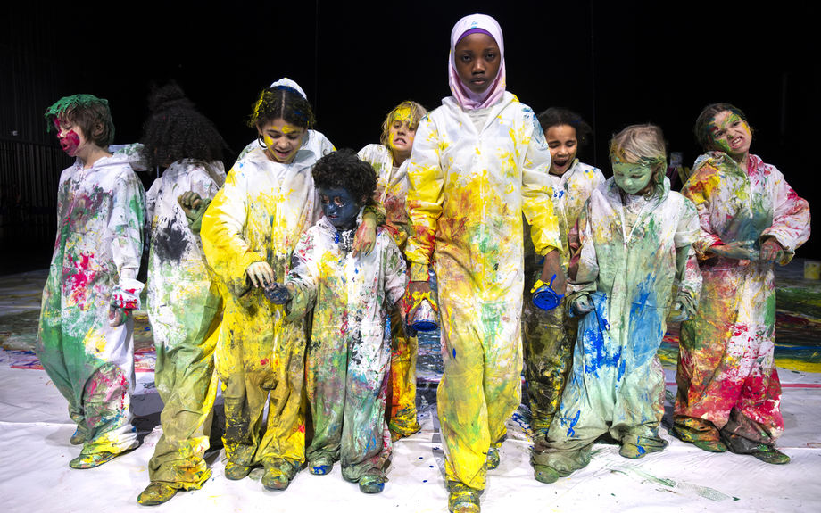 Les jeunes interprètes investissent au compte-gouttes la scène immaculée de WASCO! pour la préparer à l’ouragan qui arrive : ils et elles vont créer une chorégraphie à partir du dessin. À moins que ce ne soit l’inverse ? Pastels, pinceaux, crayons et seaux de peinture prolongent leurs mouvements, guidés par l’impulsivité d’un jazz aux formes mouvantes. Assurés et inventifs, les performeurs et performeuses, qui ont entre six et douze ans, s’abandonnent spontanément à la musique et à la couleur, s’affranchissent des règles et célèbrent l’émancipation.