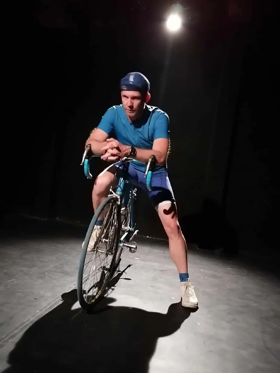 C’est le récit d’un coureur cycliste, entre introspection et leçon de vie, qui touche par sa sincérité et sa fraîcheur. Cyril Fragnière nous convie, par son expérience personnelle, à un grand écart : le passage de l’entraînement d’un sportif de haut niveau au plateau d’un théâtre. Il est initié au vélo par son père, lui-même cycliste amateur, et il entame rapidement une carrière prometteuse. Il remporte des courses, intègre l’antichambre de l’une des plus prestigieuses équipes de l’Hexagone.