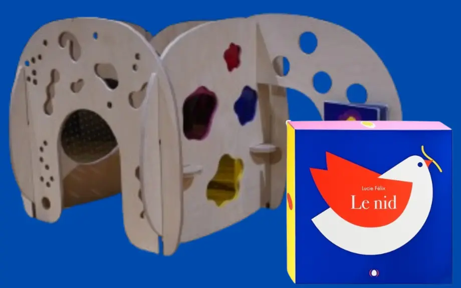 Le Nid, la cabane de Lucie Félix : Ce dispositif ludique, interactif, espace de jeux et d’expérimentation, s’inspire des ouvrages et de la démarche artistique de Lucie Félix. Il favorise la manipulation, le développement de la motricité, ainsi que les interactions avec d’autres petits lecteurs et avec les livres de l’artiste mis à disposition des enfants. Sous la forme d’une cabane, le module permet d’accueillir des jeux, des objets et des parcours. Les enfants pourront inventer des histoires et développer leur imaginaire. Ainsi, le tout-petit sera mis en position d’explorateur, avec une dimension sensorielle, dans un espace imaginé pour lui.