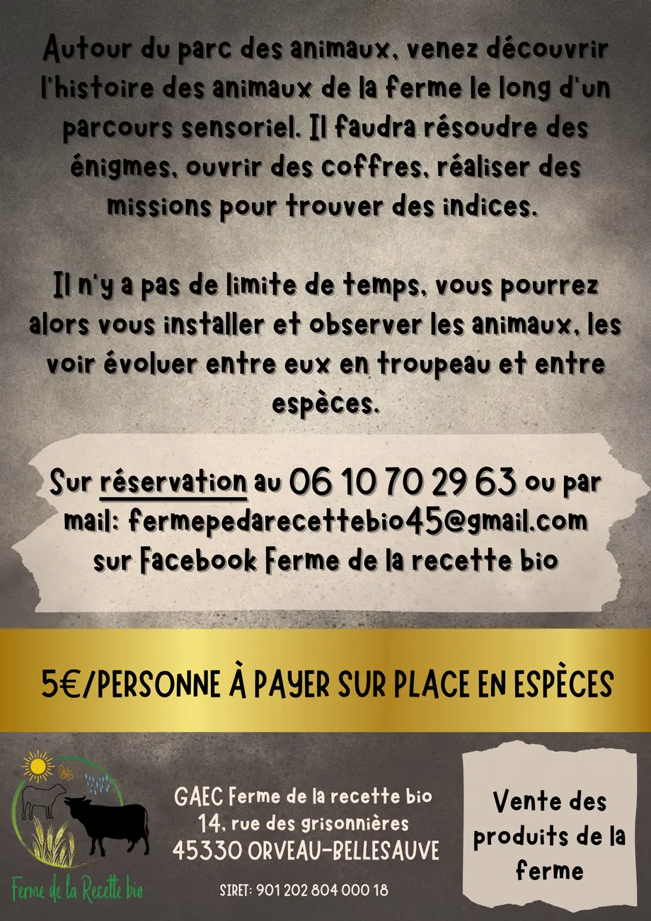 Autour du parc des animaux, venez découvrir l’histoire des animaux de la ferme le long d’un parcours sensoriel. Il faudra résoudre des énigmes, ouvrir des coffres, réaliser des missions pour trouver des indices.