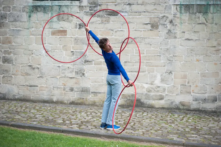 Une courte pièce pleine d’humour mêlant danse, jonglage et théâtre. Au cœur de la pièce se trouve Monsieur O, un petit bonhomme sec à l’énergie débordante qui, pour tromper sa solitude, fait tourner ses cerceaux rouges.