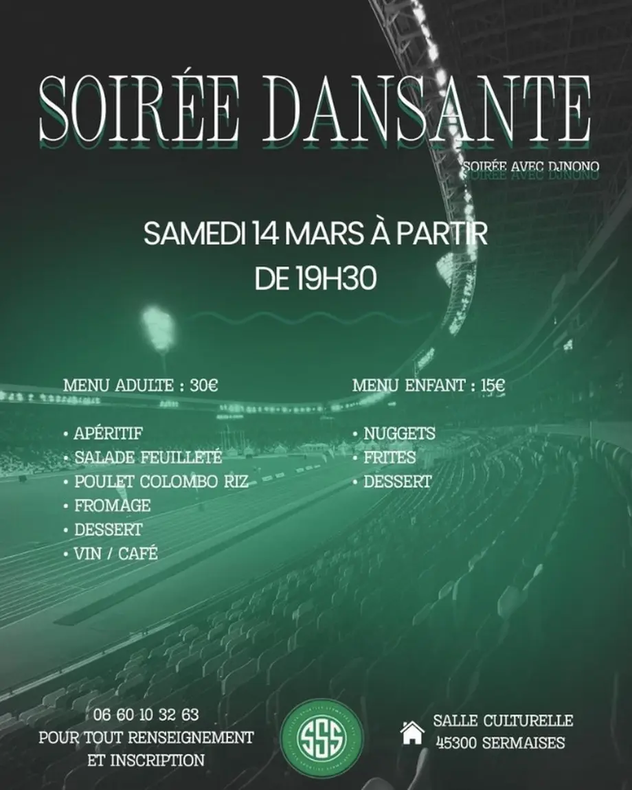 La Société Sportive Sermaisoise (SSS) invite le public à sa grande soirée dansante, le samedi 14 mars 2026. L’événement se déroule à la salle culturelle de Sermaises (45300) et débute à 19 h 30, sous l’animation musicale de DJ Nono.