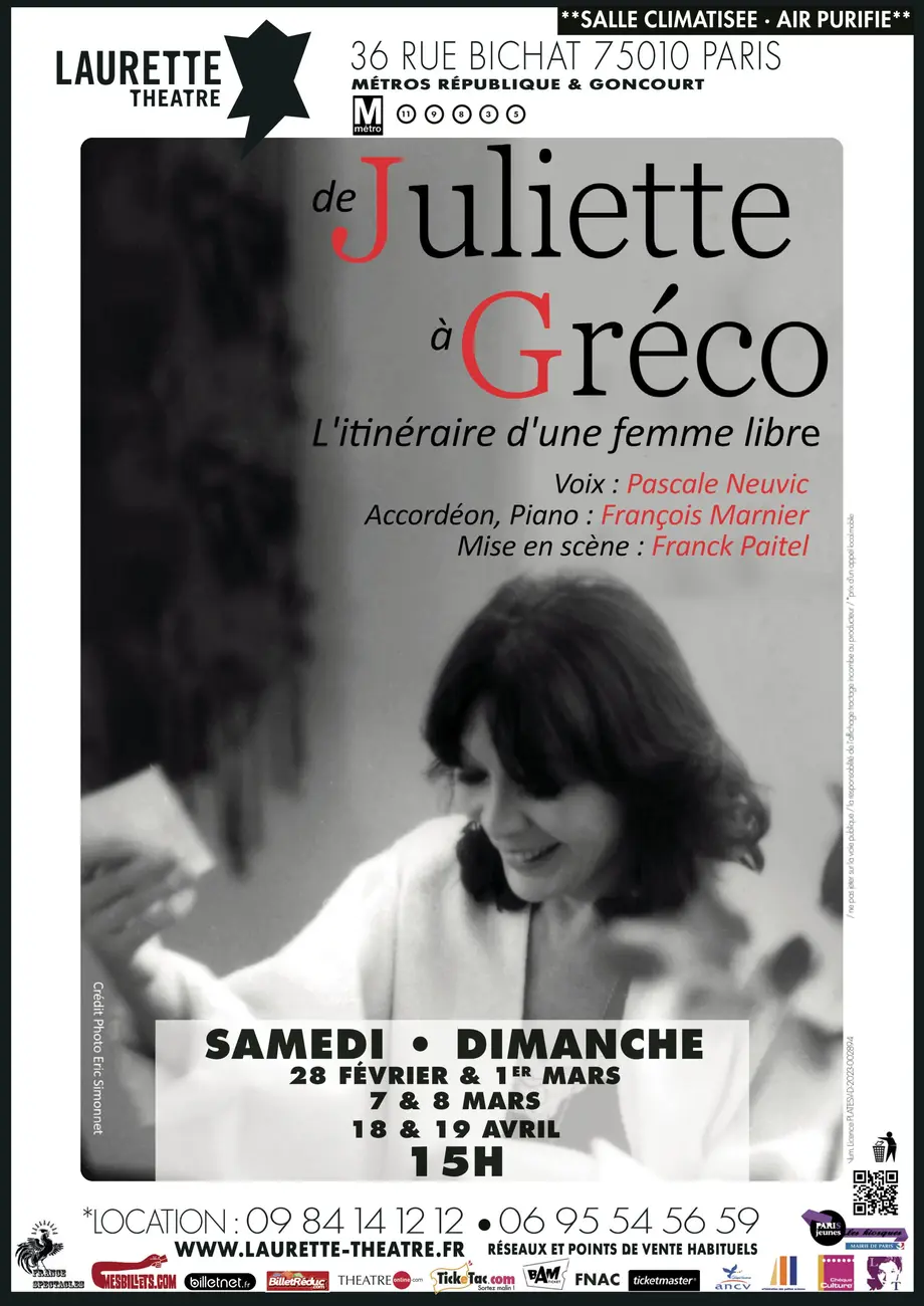 Ce spectacle musical, ponctué d'archives sonores, est un hommage à Juliette Gréco. Pascale Neuvic au chant et à la narration, François Marnier au piano et à l'accordéon nous font revivre les premières années de Juliette avant qu'elle ne devienne Gréco.