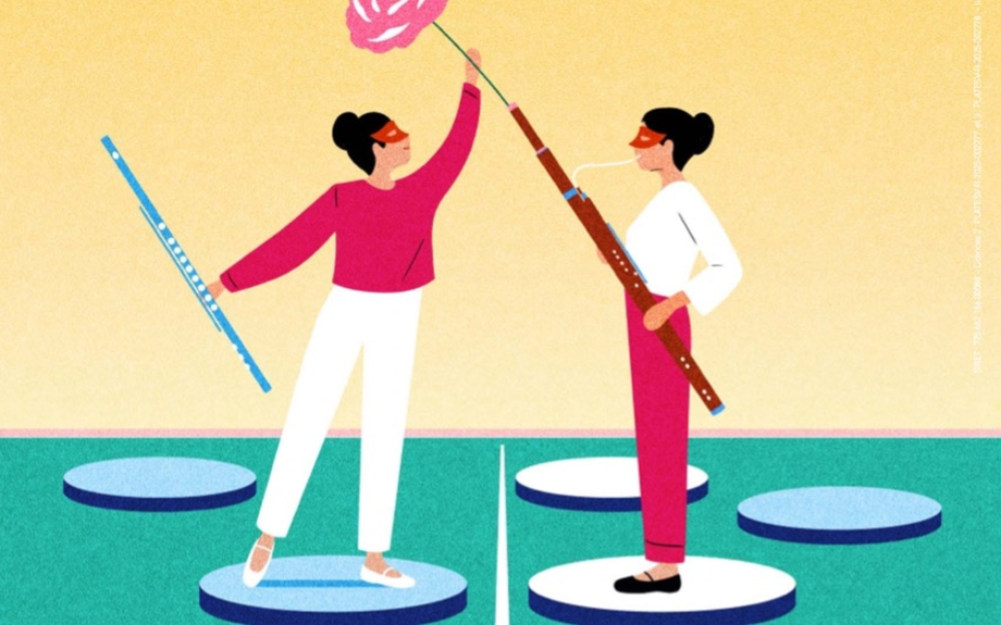 Si Fou Mi ! Sur la scène partagée en deux par une grande bande blanche, comme un immense plateau de jeu, deux sœurs s’affrontent : chacune se munit d’un instrument, flûte pour l’une, basson pour l’autre… et c’est parti !