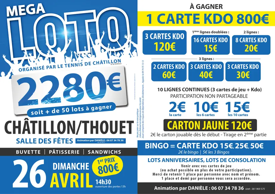 Méga loto animé par Danièle et organisé par le Tennis Club de Châtillon-sur-Thouet, le dimanche 26 avril 2026.