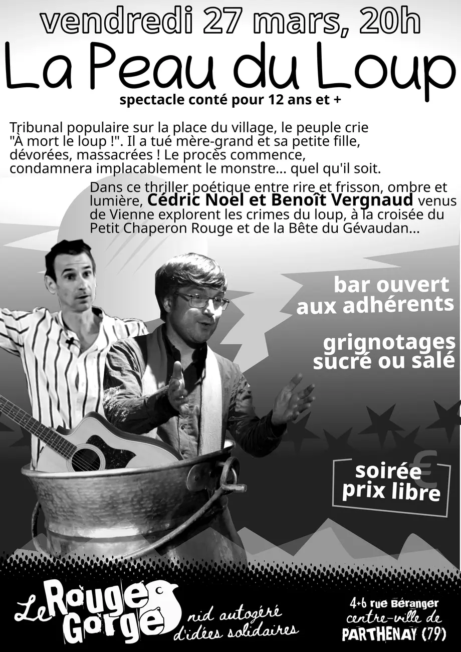 Dans ce thriller poétique, entre rire et frissons, ombre et lumière, Cédric Noël et Benoît Vergnaud, venus de Vienne, explorent les crimes du loup, à la croisée du Petit Chaperon rouge et de la Bête du Gévaudan...