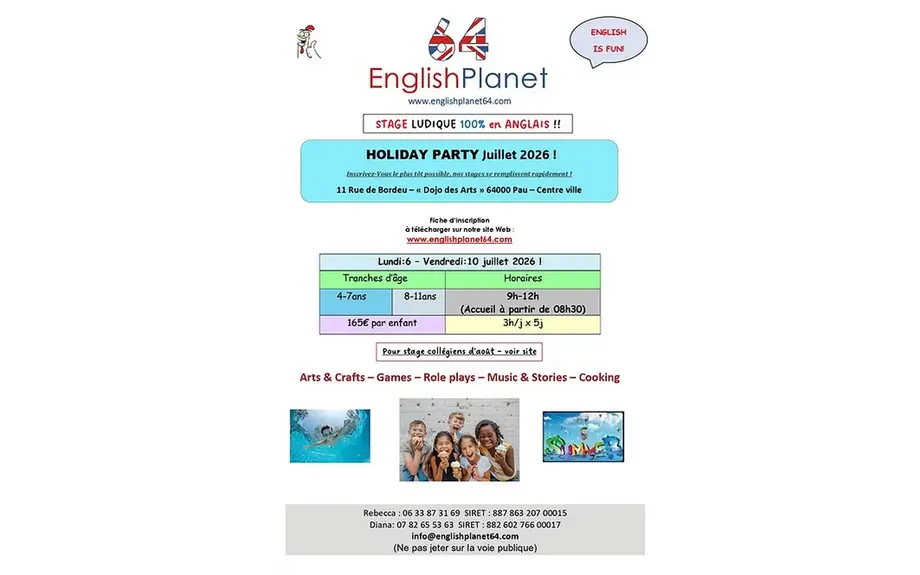 English Planet - Stage anglais "Holiday party"Du 24/08/2026 au 28/08/2026PauDescription :