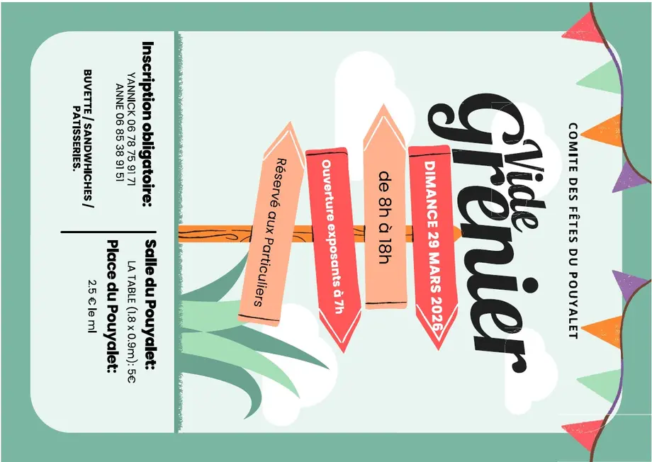 Le Comité des Fêtes du Pouyalet organise son vide-greniers dans la salle des fêtes du Pouyalet et sur la place.