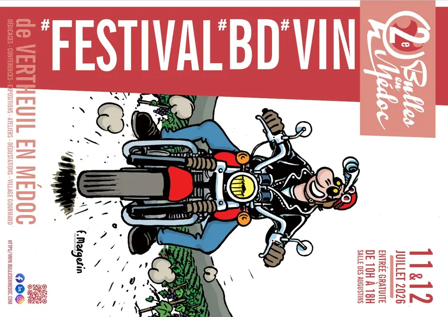 L’Association Bulles en Médoc organise la seconde édition de son festival réunissant bande dessinée et vin. Un plateau d’une dizaine de dessinateurs de bande dessinée de renommée locale et nationale sera présent, parmi lesquels Éric Corbeyran et Frank Margerin. Des vignerons du Médoc seront également de la partie.