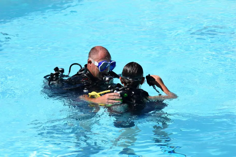 Baptême de plongée sous-marine avec bouteille, en piscine.