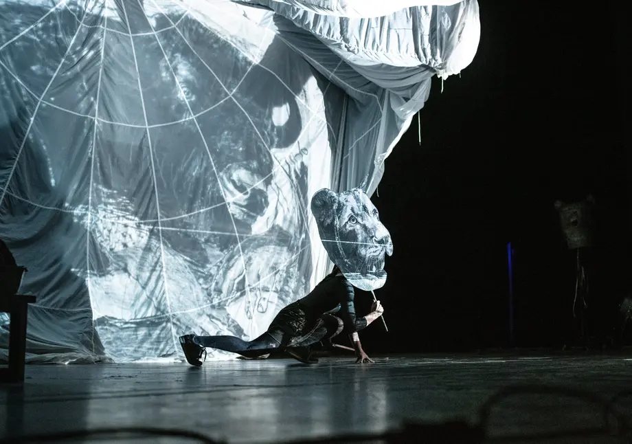 Ce spectacle visuel mêle au plateau trois artistes qui se métamorphosent peu à peu en hybrides issus du bestiaire préhistorique :