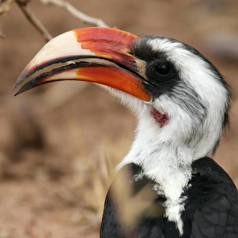 Gros plan d'un calao avec un grand bec rouge et jaune, des plumes noires et blanches et un arrière-plan sec et flou.