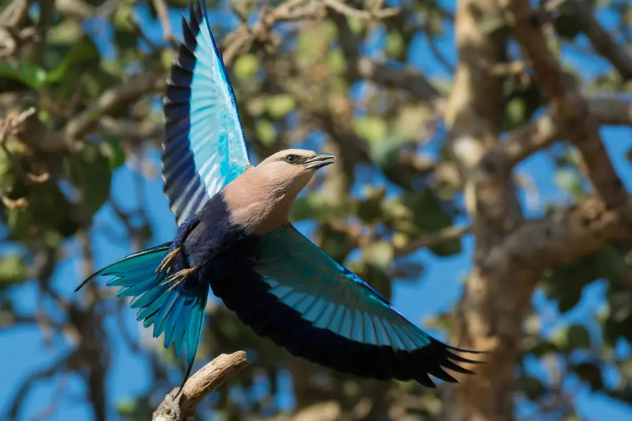 Un oiseau aux couleurs vives, aux ailes bleues et à la tête brune, prend son envol sur fond de branches feuillues et de ciel dégagé.