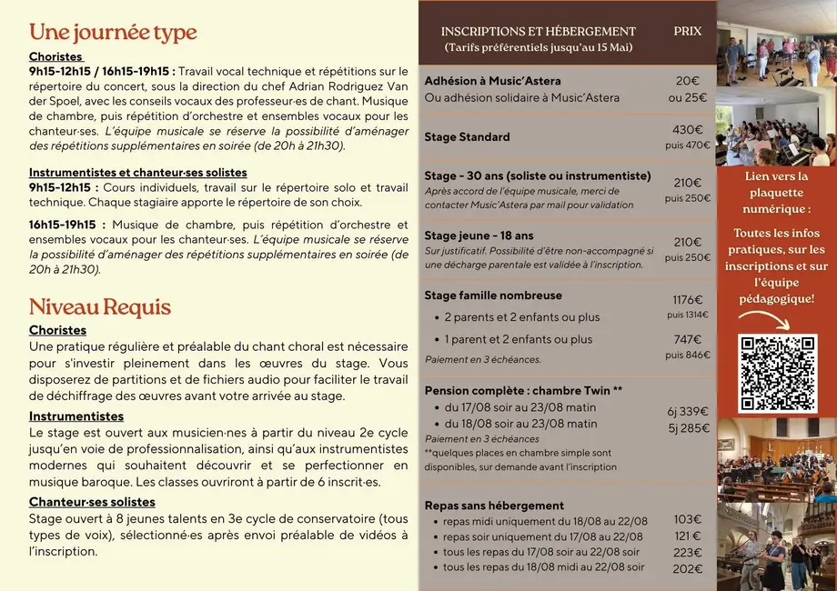 Stage standard 430€ | Stage jeunes moins de 30 ans 210 € | Tarifs famille nombreuse | Hébergement en supplément