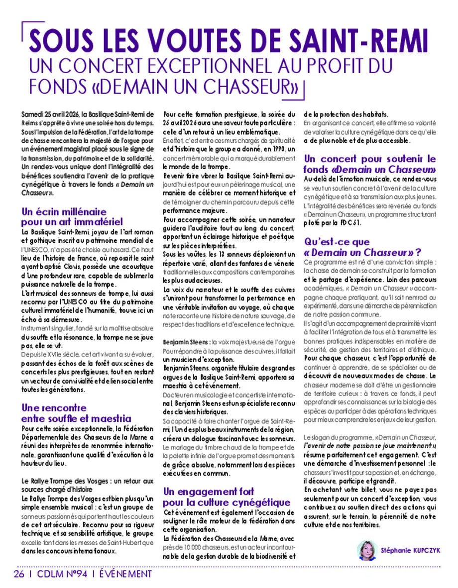 Sous ses voûtes millénaires, le Rallye Trompes des Vosges fera résonner toute la puissance et l’émotion de la trompe de chasse, accompagné de Benjamin Steen, organiste titulaire des grandes orgues de la basilique.
