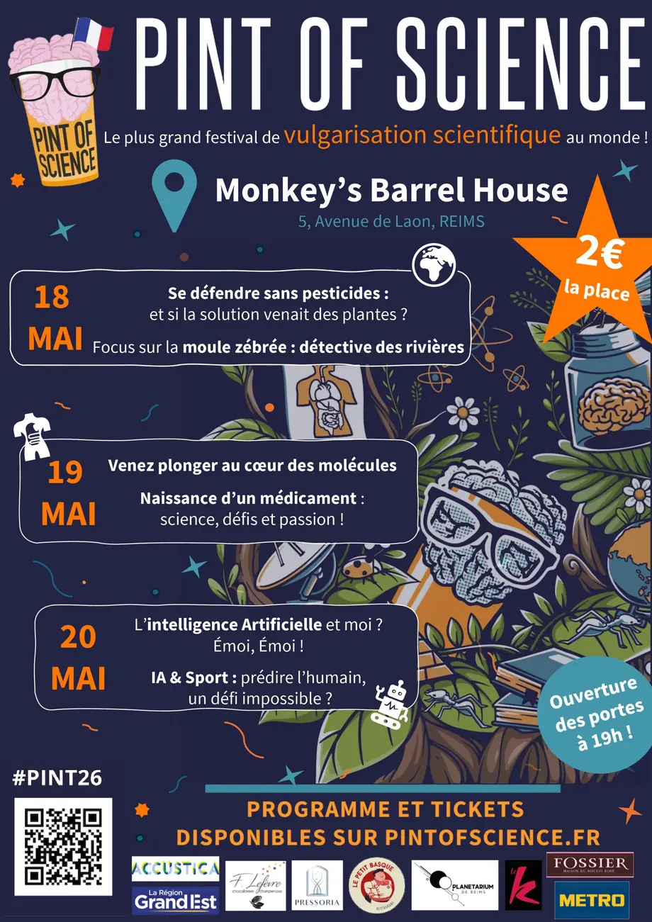 Un grand merci à tous nos sponsors pour cette édition de Pint of Science 2026 : Pressoria, Accustica, Le Petit Basque, le K, La région Grand Est, la Maison Fossier, le Planétarium de Reims, la Chocolaterie Champenoise et Métro !