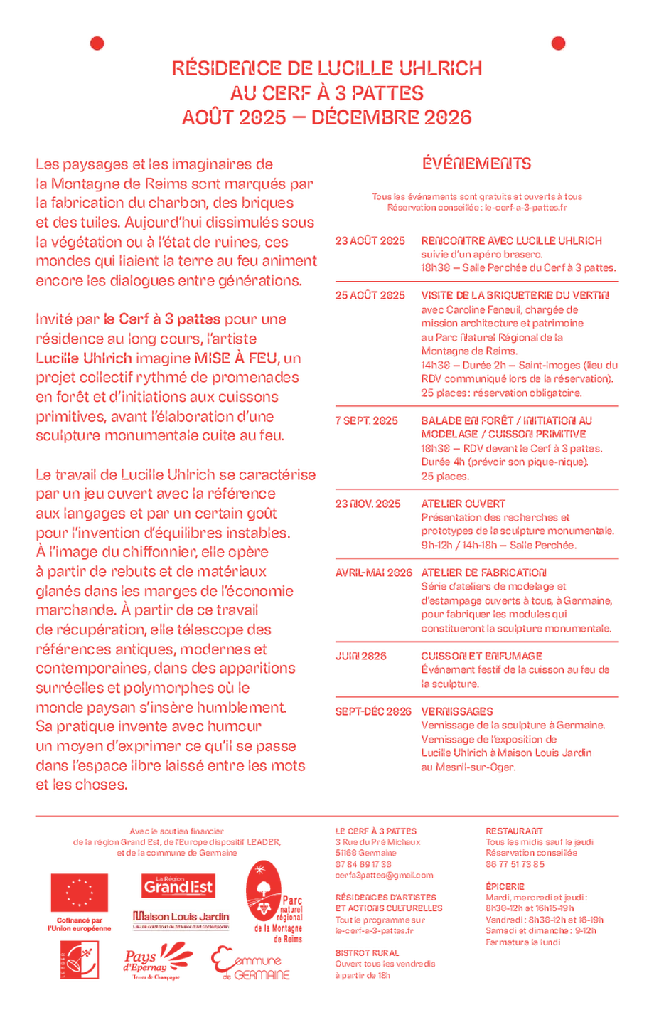 Les paysages et les imaginaires de la Montagne de Reims sont marqués par la fabrication du charbon, des briques et des tuiles. Aujourd'hui dissimulés sous la végétation ou à l'état de ruines, ces mondes qui liaient la terre au feu animent encore les dialogues entre générations. Invité par le Cerf à 3 pattes pour une résidence au long cours, l'artiste Lucille Uhlrich imagine MISE À FEU, un projet collectif rythmé de promenades en forêt et d'initiations aux cuissons primitives, avant l'élaboration d'une sculpture monumentale cuite au feu.