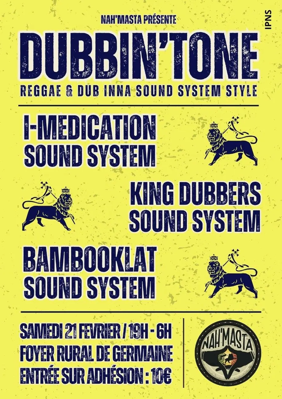 L'association Nah'Masta est heureuse de vous retrouver de nouveau à la salle du Foyer Rural de Germaine (51160) pour la 7ème éditions de ses meetings Sound System : la "Dubbin'Tone" !!!!