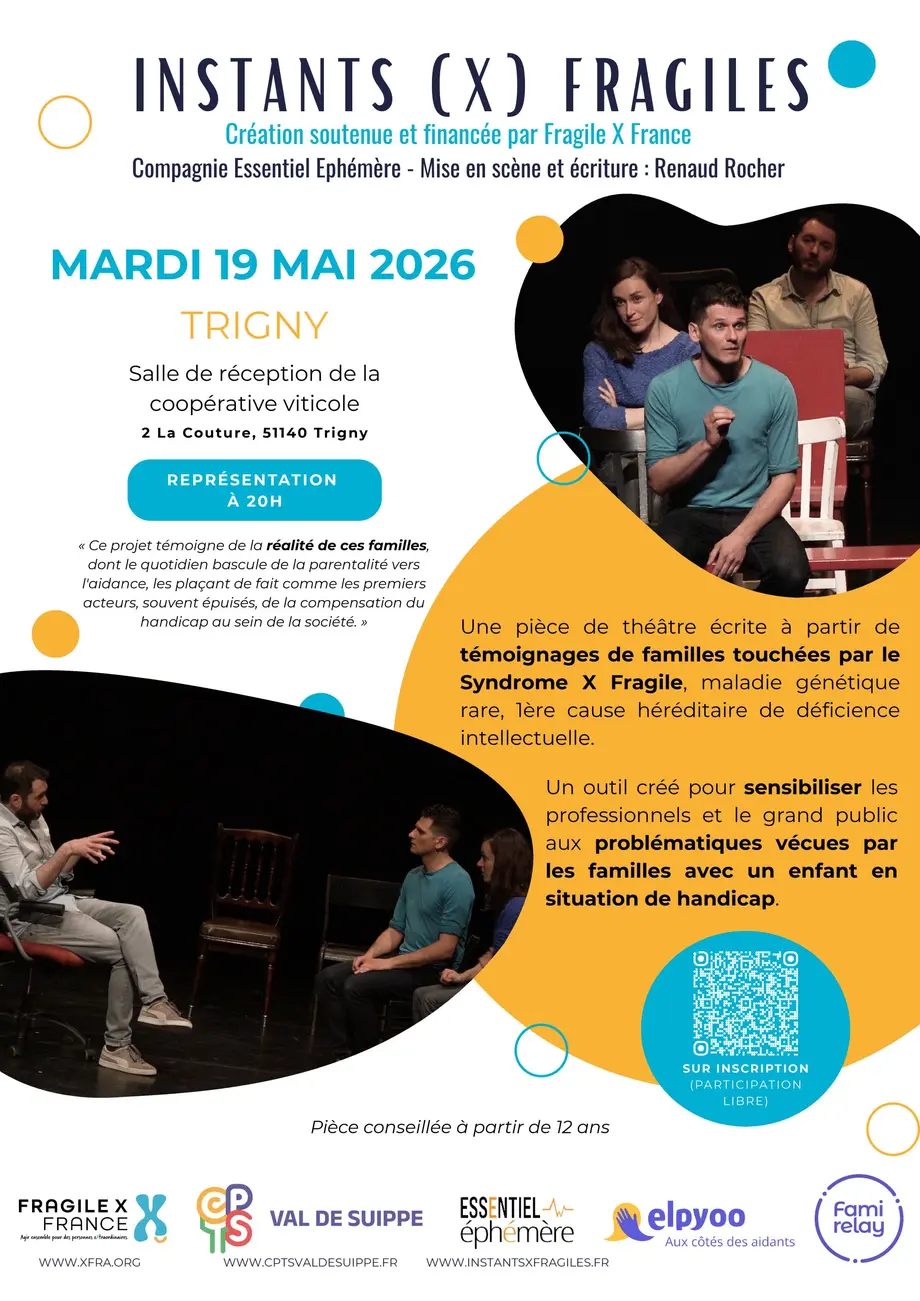 La compagnie Essentiel Éphémère et l'association Fragile X France vous invitent à une représentation exceptionnelle de la pièce "Instants (X) Fragiles". Écrit à partir de témoignages réels, ce spectacle de 1h20 lève le voile sur le quotidien des familles confrontées à la déficience intellectuelle.