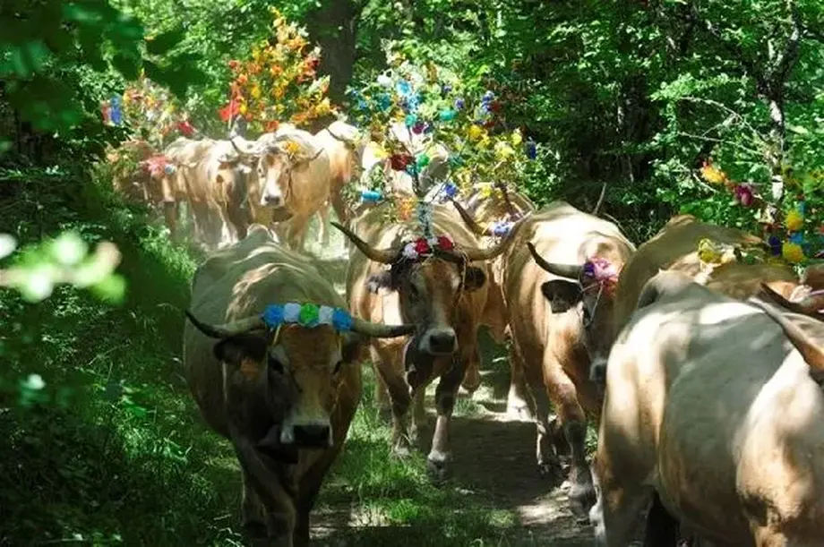 Balade pédestre au pas du troupeau de vaches de race Aubrac, en transhumance et appartenant à Clément et Cécile CHASSALY, de Grun, reliant Saint-Martin-de-Lenne à Saint-Geniez-d'Olt (12 km).