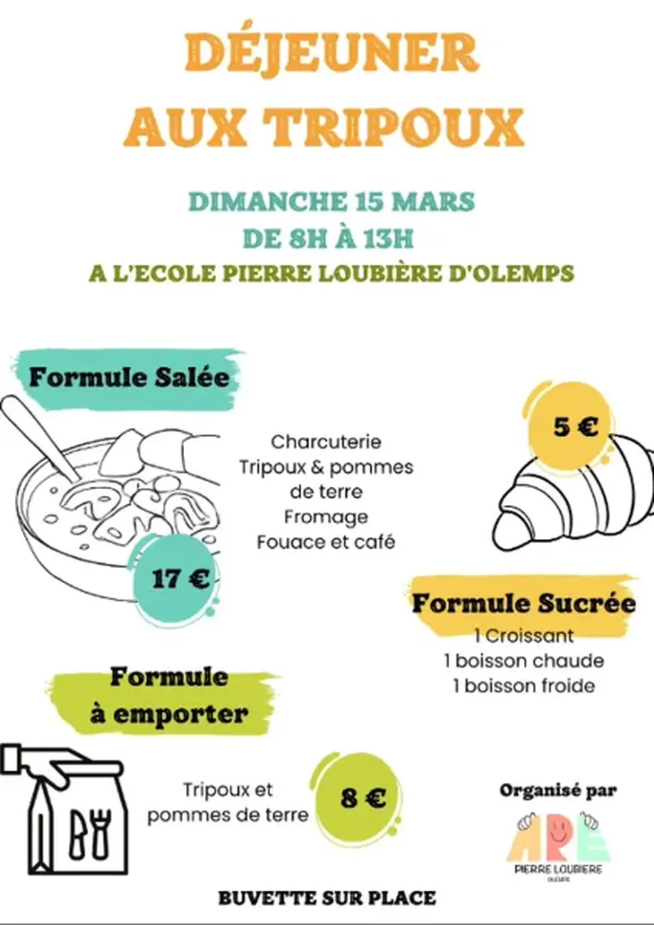Déjeuner tripoux ou tête de veauLe 12/04/2026RoussennacDéjeuner tripoux ou tête de veau à la salle des fêtes, à partir de 8 h.