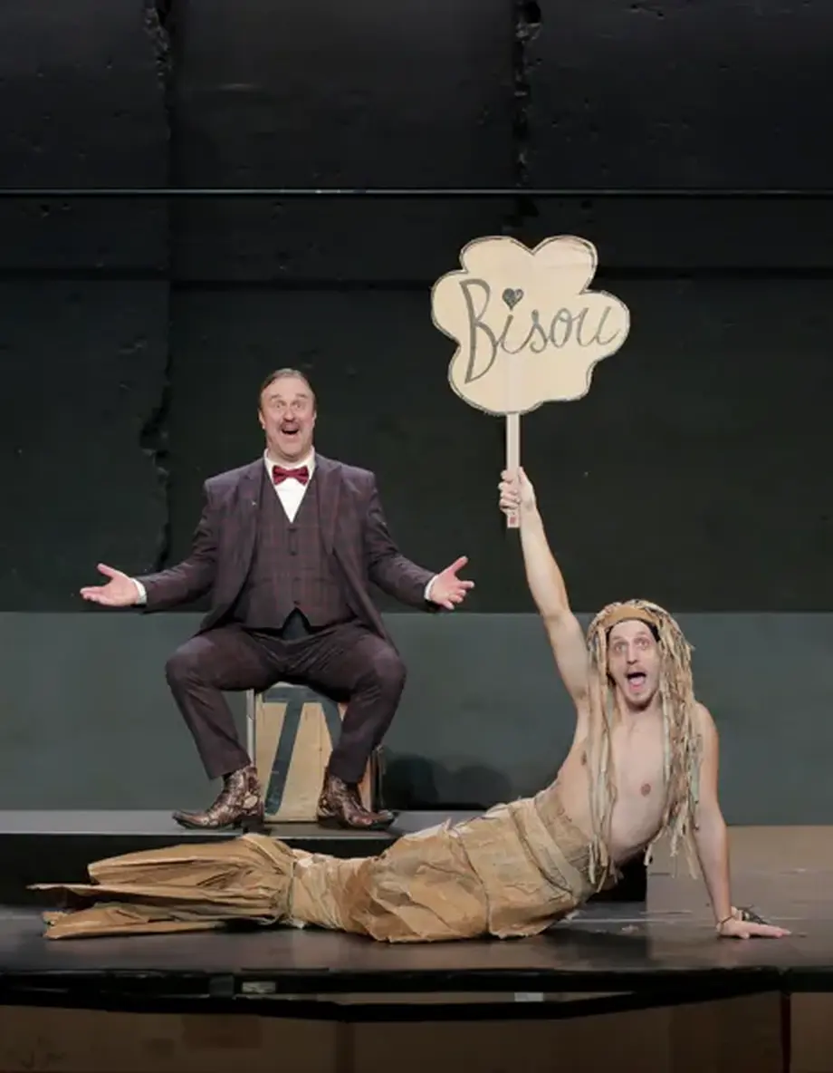 Mais l’acteur en costume trois pièces reste assis, c’est la folie du spectacle. Son acolyte en maillot de bain s’agite autour de lui avec des centaines de morceaux de carton où sont inscrits les noms des pays, accessoires ou bestioles rencontrées.