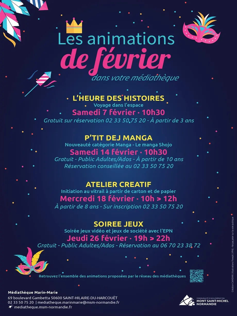 Atelier créatifLe 17/02/2026 Saint-Sauveur-le-VicomteVenez participer à un atelier créatif à la médiathèque de Saint-Sauveur-le-Vicomte, sur le thème du carnaval.