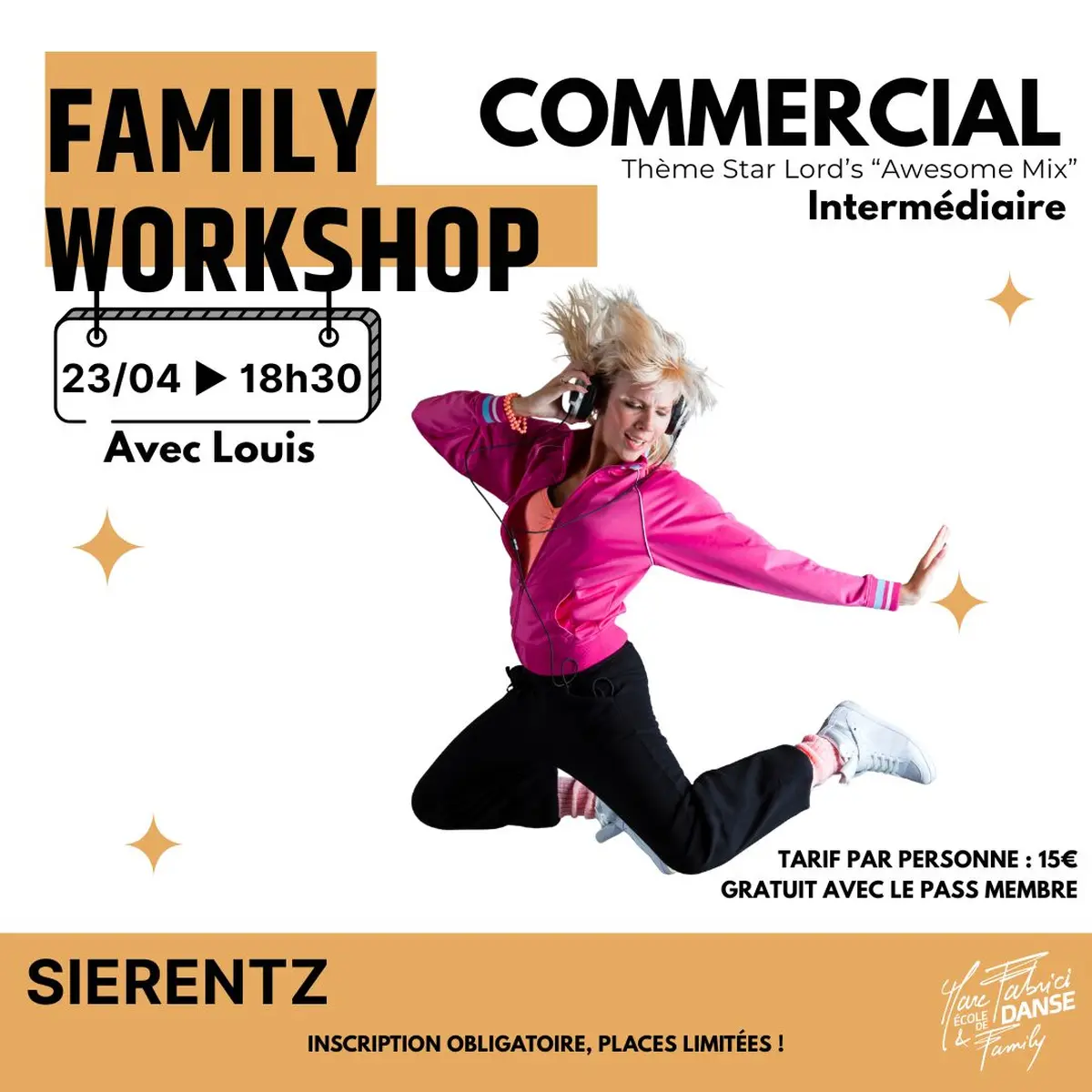 L’École de Danse Marc Fabrici & Family propose un Family Workshop Commercial niveau intermédiaire, destiné aux danseur·ses souhaitant approfondir leur pratique dans un univers dynamique et musical.