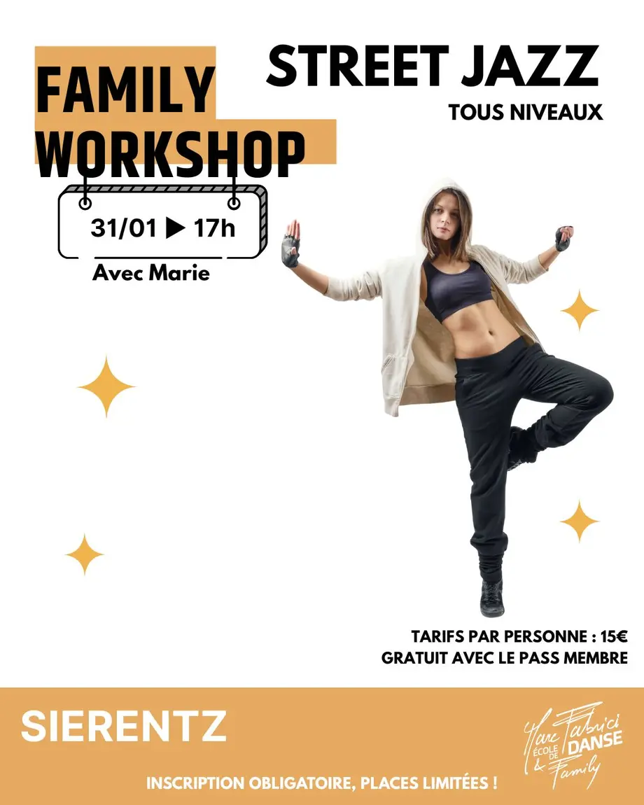 Pensé pour favoriser le plaisir de danser et l’expression personnelle, ce Family Workshop s’adresse à toute personne souhaitant découvrir le Street Jazz ou enrichir sa pratique, dans une ambiance conviviale et motivante.