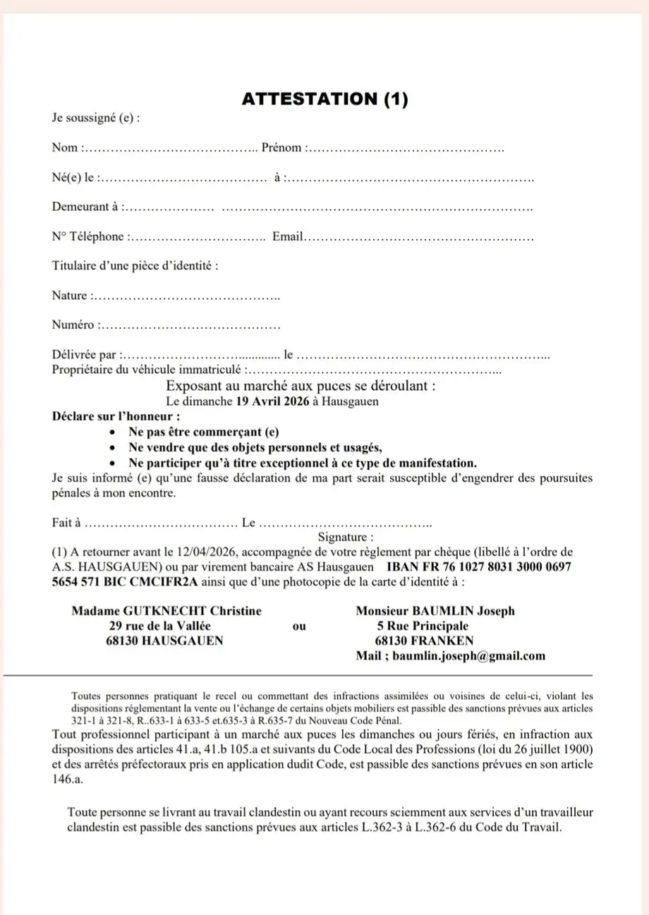 Vide-Greniers BENDORFLe 03/05/2026BendorfL’Association Culturelle de Bendorf a le plaisir d’organiser son grand vide-grenier le dimanche 3 mai 2026 à Bendorf. Cet […]
