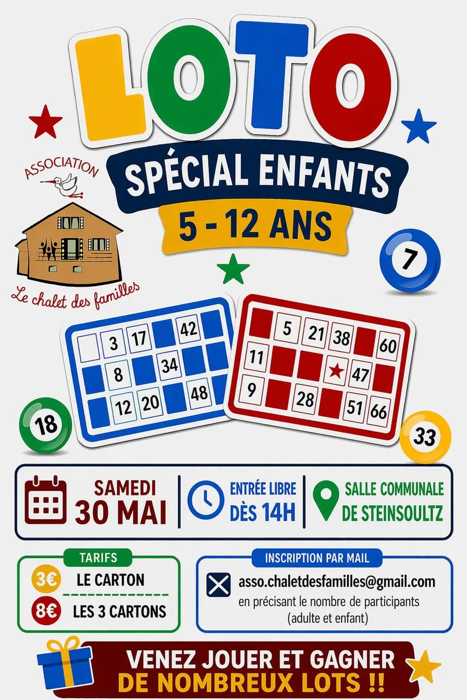 L'association Le Chalet des Familles vous propose son premier loto spécial enfants de 5 à 12 ans.