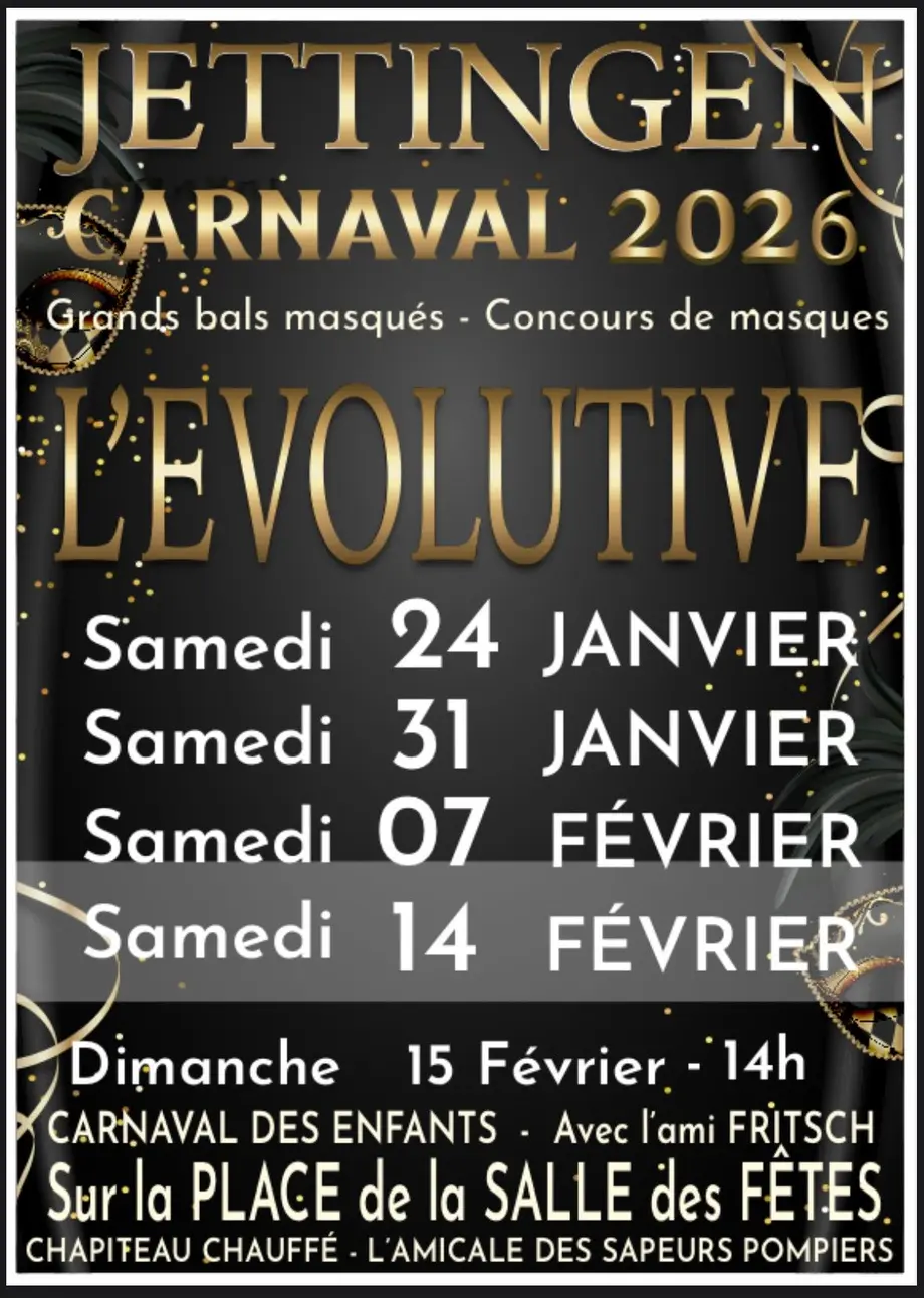 Les festivités sont organisées par l'Amicale des Sapeurs Pompiers de Jettingen. Plusieurs bals masqués sont proposés à Jettingen les samedis 24, 31 janvier et 07,14 février 2026, animés par l'Orchestre L'Evolutive, fidèle au poste depuis plusieurs années dans la commune du Sundgau. 1100€ de prix par soirée sont prévus pour récompenser généreusement les groupes masqués qui continueront d'assurer la réputation de ces soirées.Cet événement festif sera une occasion parfaite pour partager des moments de joie et de convivialité en famille et entre amis.Profitez d'une délicieuse petite restauration avec un large choix pour recharger vos batteries et faire la fête en dansant au rythme du carnaval.