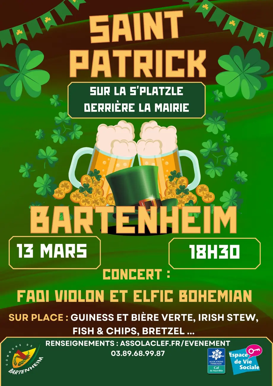 Le 13 mars à partir de 18h30, rendez-vous sur la placette derrière la mairie de Bartenheim pour une soirée aux couleurs de l’Irlande, ambiance festive, conviviale et chaleureuse à l’occasion de la Saint Patrick. Venez célébrer cet événement incontournable dans la bonne humeur !