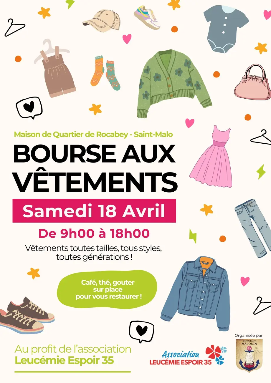 Le Rotaract malouin vous invite à sa bourse aux vêtements le samedi 18 avril 2026 de 9h à 18h.