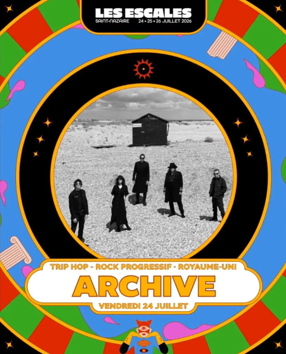 Le groupe britannique Archive rejoint la programmation du festival Les Escales 2026 pour un concert exceptionnel le vendredi 24 juillet. Cette formation légendaire du trip-hop et rock progressif se produira dans le cadre du festival de Saint-Nazaire, dont l'édition 2026 se déroulera du 24 au 26 juillet 2026.
