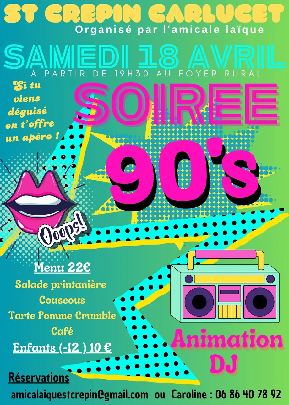 L’Amicale laïque de Saint-Crépin-Carlucet vous invite à une soirée festive sur le thème des années 90, le samedi 18 avril à partir de 19 h 30, au foyer rural.
