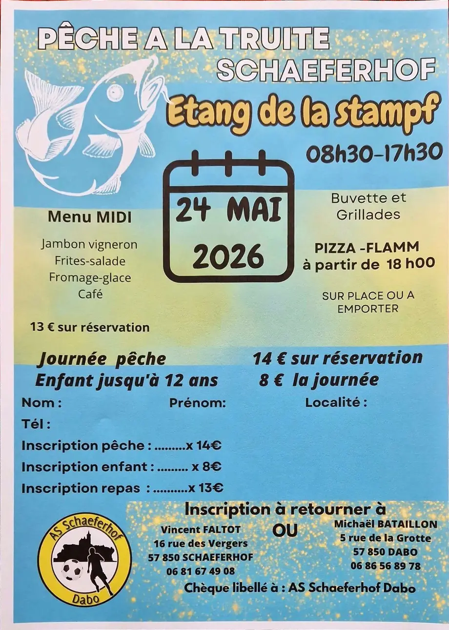 L’AS Schaeferhof Dabo organise le Dimanche 24 Mai de 8h30 à 17h30 sa Journée ‘Pêche à la truite’ autour de l’étang de la Stampf à Schaeferhof.