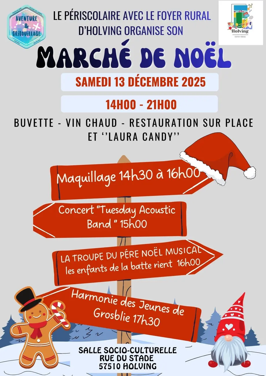 Le périscolaire d'Holving - Richeling avec le soutien du Foyer Rural d'Holving, organise son Marché de Noël. L'événement se tiendra le 13 décembre 2025 à la salle socio-culturelle. Le marché sera ouvert de 14h00 à 21h00. Une maquilleuse pour enfant sera présente de 14h30 à 16h00. A 15h00, c'est le groupe 'Tuesday Acoustic Band' accompagné de la chorale Voix si Voix la qui inviteront les visiteurs par des airs musicaux et des chants, à entrer dans la magie de Noël. Il y aura également vers 16h00 un défilé aux lampions accompagné du Père Noël en calèche, suivi en musique par 'les enfants de la batte rient'. Les enfants auront la possibilité d'acheter des lampions pour participer au défilé. Et enfin, à partir de 17h30, nous pourront entendre l'Harmonie des Jeunes de Grosbliederstroff jouer des chants de Noël à l'aide d'instruments de musique.