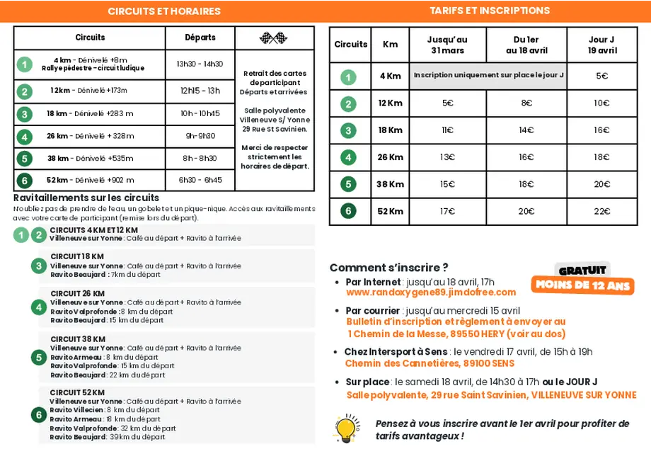 Les Portes de Villeneuve-sur-Yonne reviennent dans leur édition complète, avec cinq circuits de 12 à 52 km et un petit rallye pédestre familial de 4 km dans Villeneuve-sur-Yonne l’après-midi !
