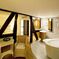 Les beaux jours, il est possible de réserver une table sur l'agréable terrasse d'été. Et si jamais vous êtes trop fourbu pour rentrer, vous pouvez toujours demander l'une des dix chambres à thème à l'étage. Marie Arbeit nous fait la visite. Chaque chambre est décorée en fonction du métier d'un ancêtre de la famille. Il y a la laitière, le meunier... Coup de coeur pour la Mimosa où chambre et salle de bains forment une seule et même pièce.