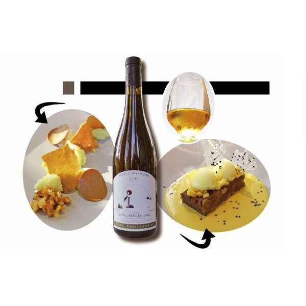 D'autre part, elle nous régale avec un second dessert nommé Saveurs autour de la Reinette : compotée tiède et mousse de pomme Reinette, tuiles pralinées, avec une petite glace maison à la noix. Dégustation du V.T. : « Au nez, on a de suite l'abricot puis des notes mentholées. L'équilibre sucre/acidité est exemplaire sur ce Wiebelsberg, c'est soyeux tout en restant minéral, avec une grande longueur. Le Riesling s'épanouit sur le grès d'Andlau, on en a ici la preuve. En fin de bouche, des amers délicats », commente avec précision Nicolas Jeangeorge.