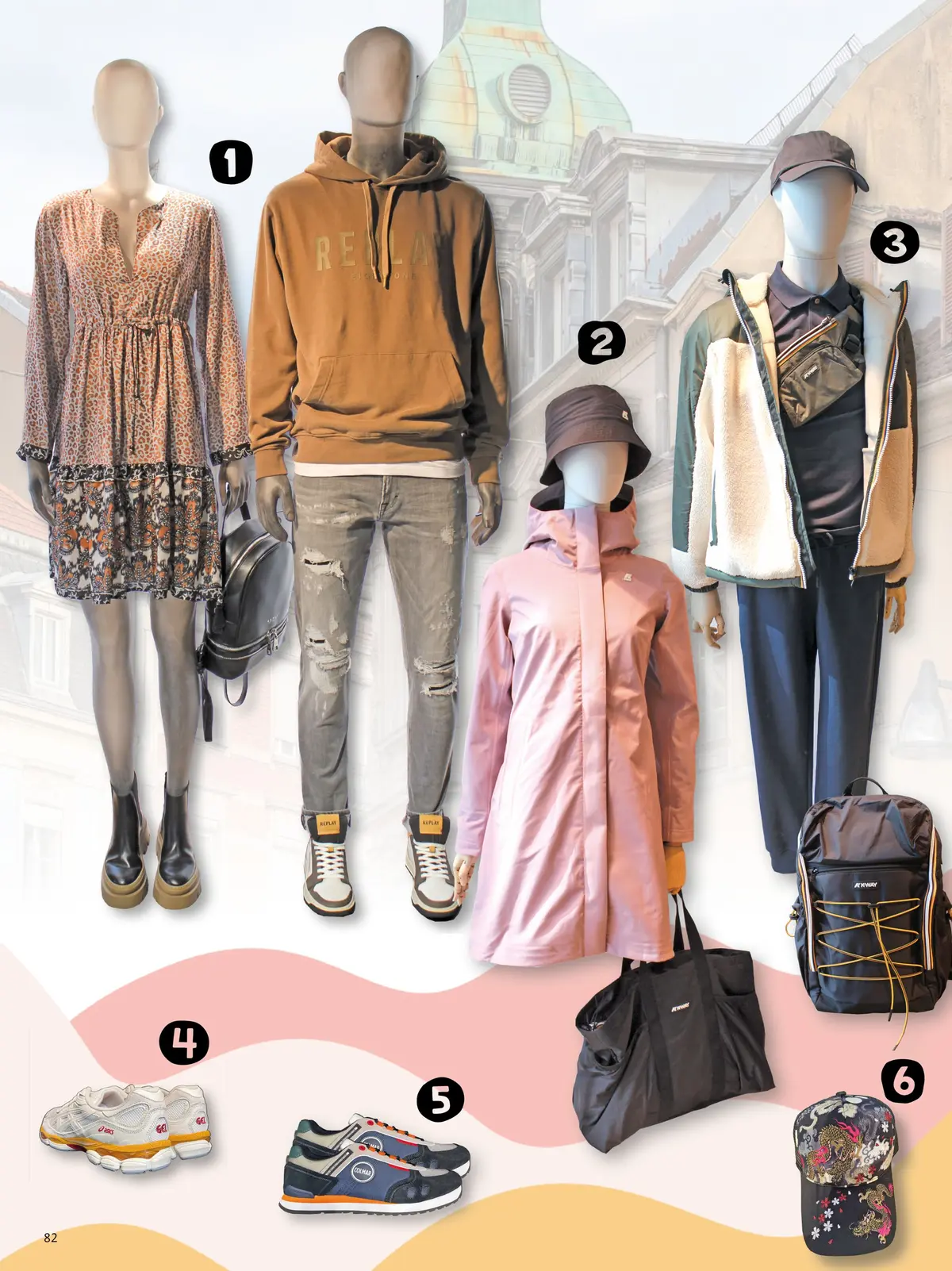 1. Couple trendy ! Un total look de la marque Replay raccord avec une robe imprimée aux motifs fantaisie, aux boots et au sac à dos en cuir noir pour la femme et un look casual pour l’homme avec un hoodie camel, un jean gris used et des baskets. À retrouver dans la boutique Replay à Mulhouse.