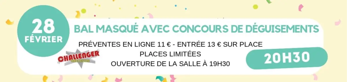 L'événement se déroule de 20h30 à 2h30 et propose six heures d'animations musicales avec l'orchestre Challenger. Cette soirée est réservée aux plus de 16 ans avec un contrôle d'identité à l'entrée, garantissant une ambiance appropriée pour ce bal masqué qui marquera le lancement des festivités carnavalesques.