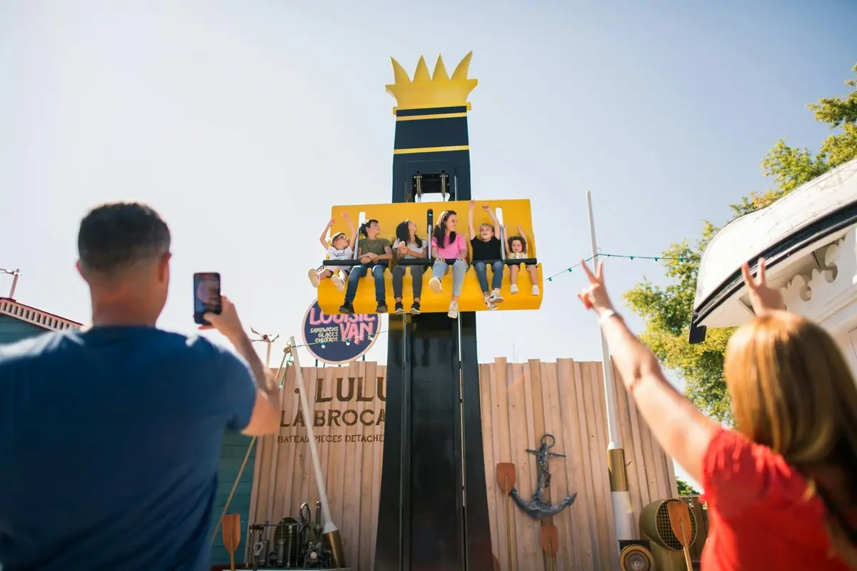 Personnes profitant d'un manège sur le thème du bateau, avec un phare et une grande balançoire en arrière-plan, sous un ciel dégagé.