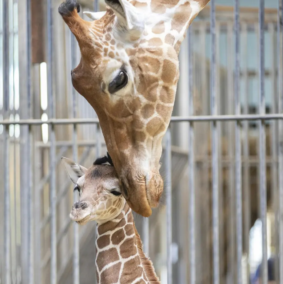 Une girafe adulte se blottit contre un bébé girafe à l'intérieur d'un enclos.