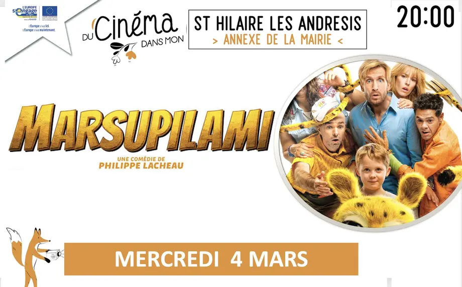 Du cinéma dans mon villageLe 12/03/2026ChuellesDiffusion des films Marsupilami à 16 h 30 (séance à 5 € pour tous) et Gourou à 20 h 00, à la salle polyvalente de Chuelles.